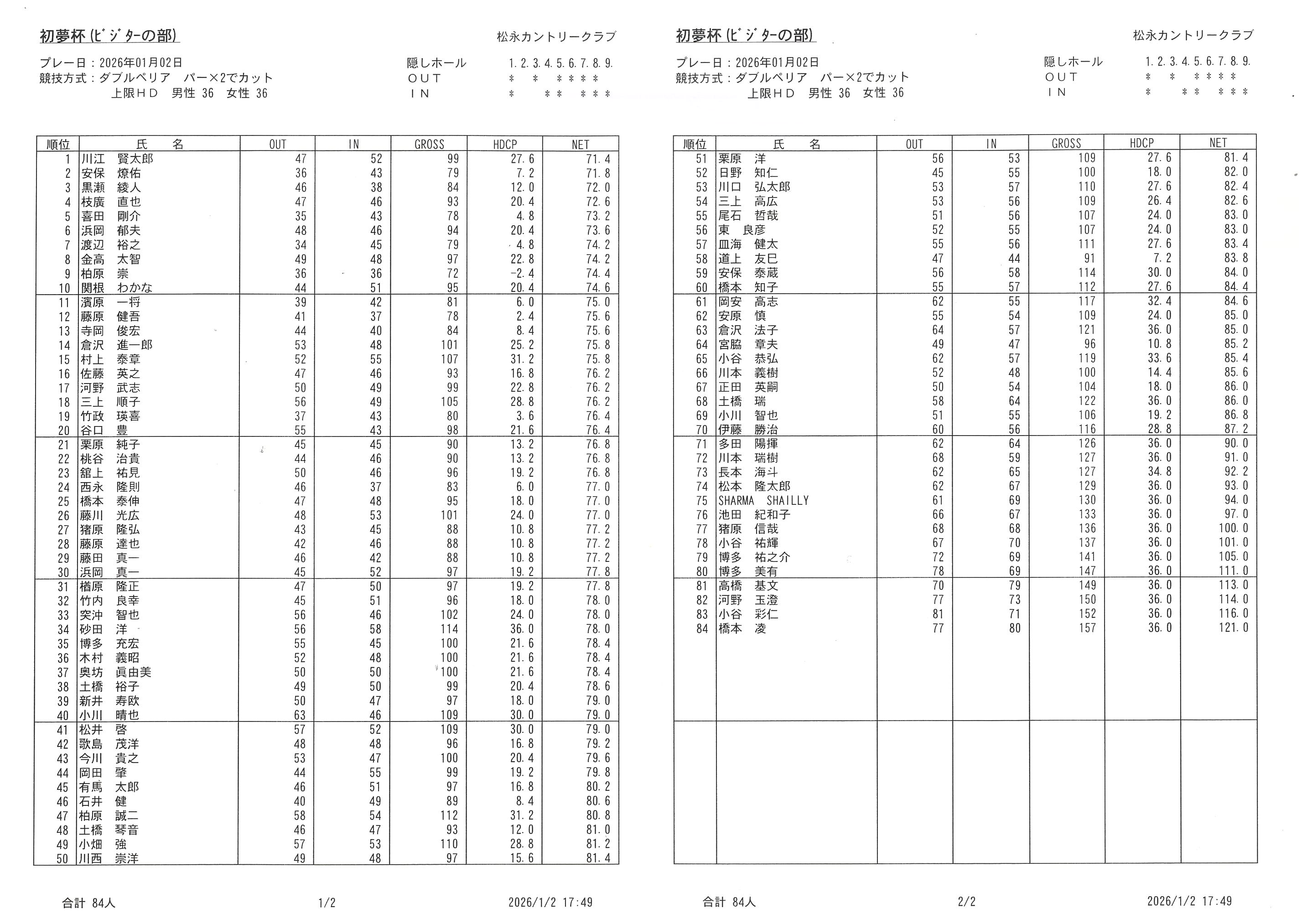 2026年1月2日初夢杯成績表(ビジターの部)