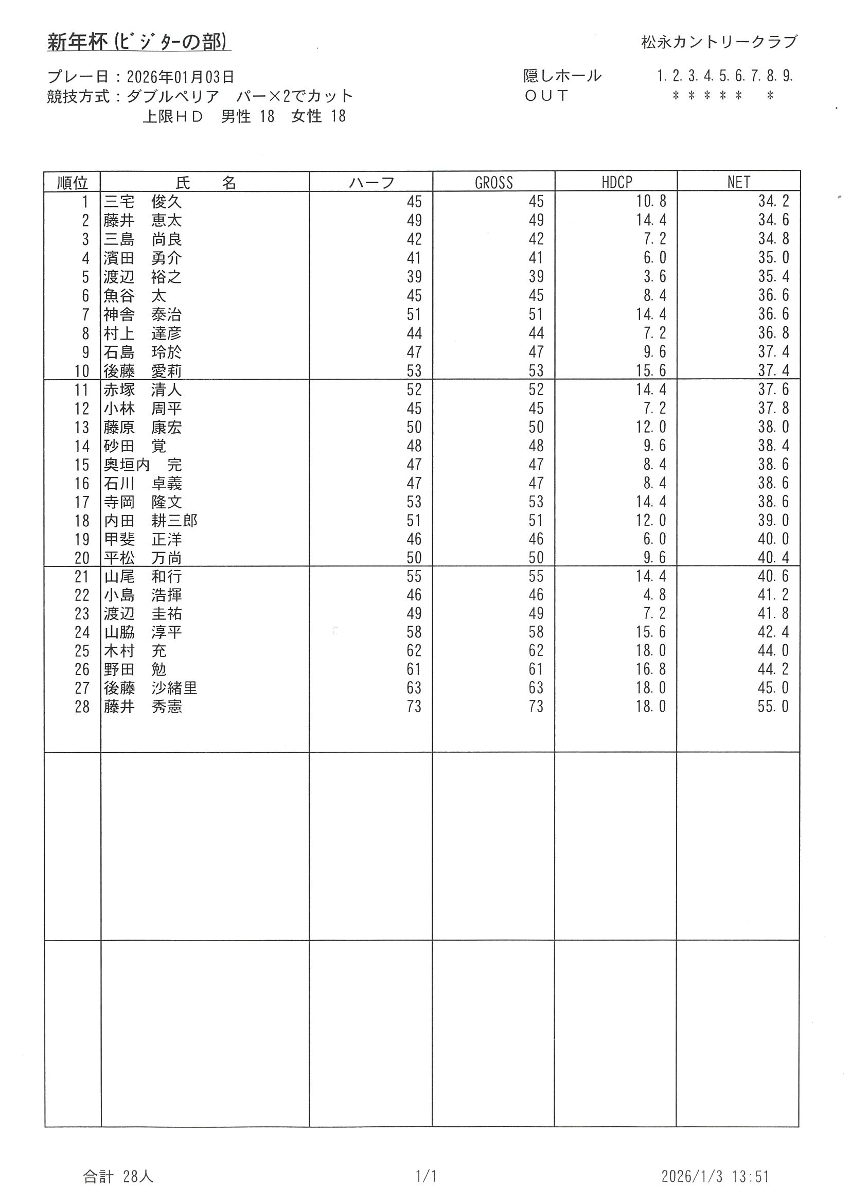 2026年1月3日新年杯成績表(ビジターの部)