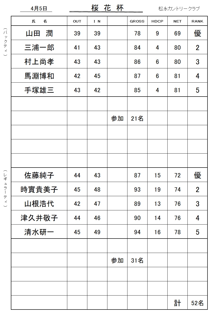 2026年4月5日 桜花杯成績表