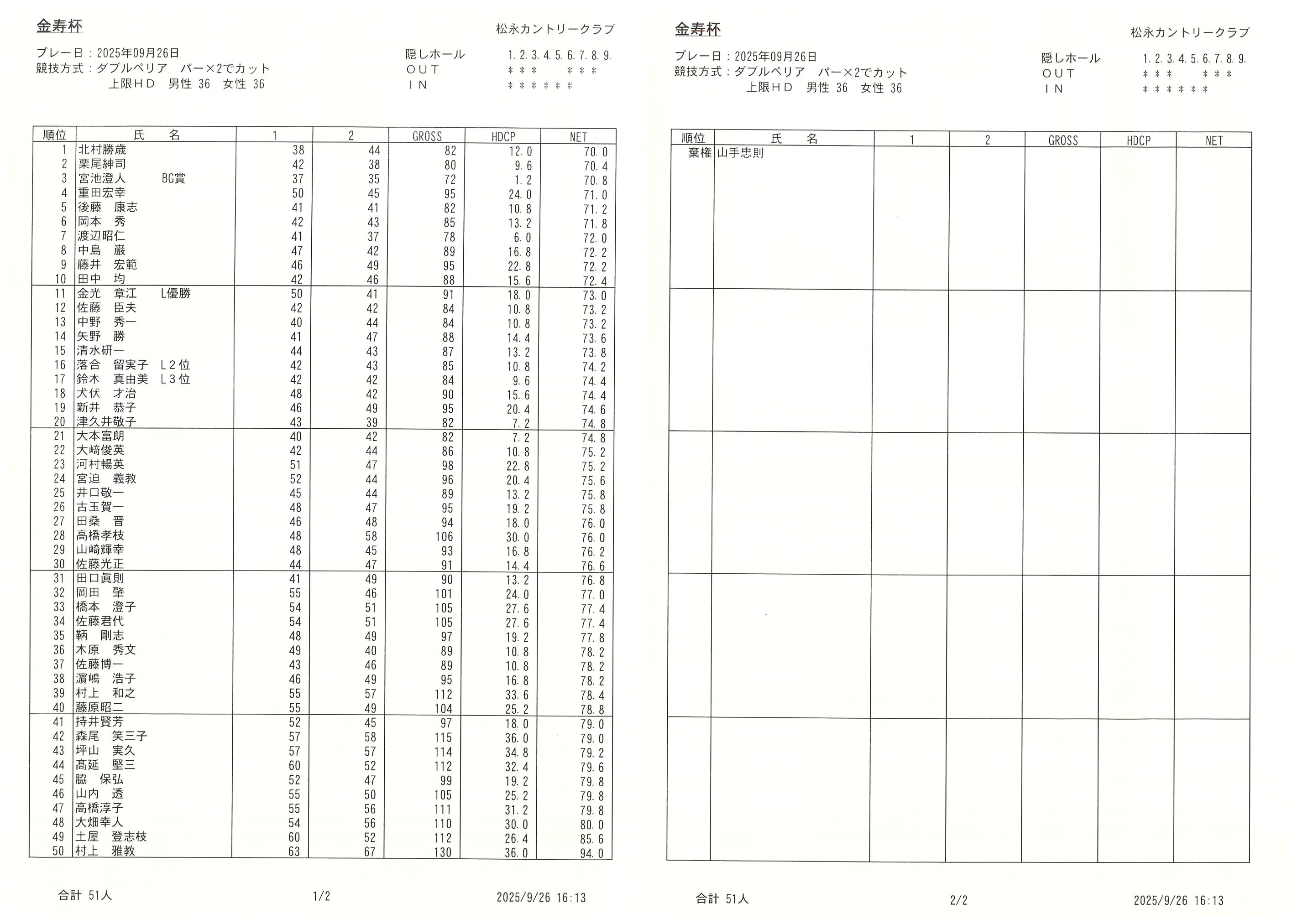 2025年9月26日 金寿杯成績表